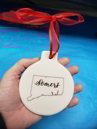Each ceramic ornament is customized with the name of the town and the outline of the state. The backside will feature the current year or may be customized with a short phrase, name, or range of dates. ( ex. Our First Home 2020)